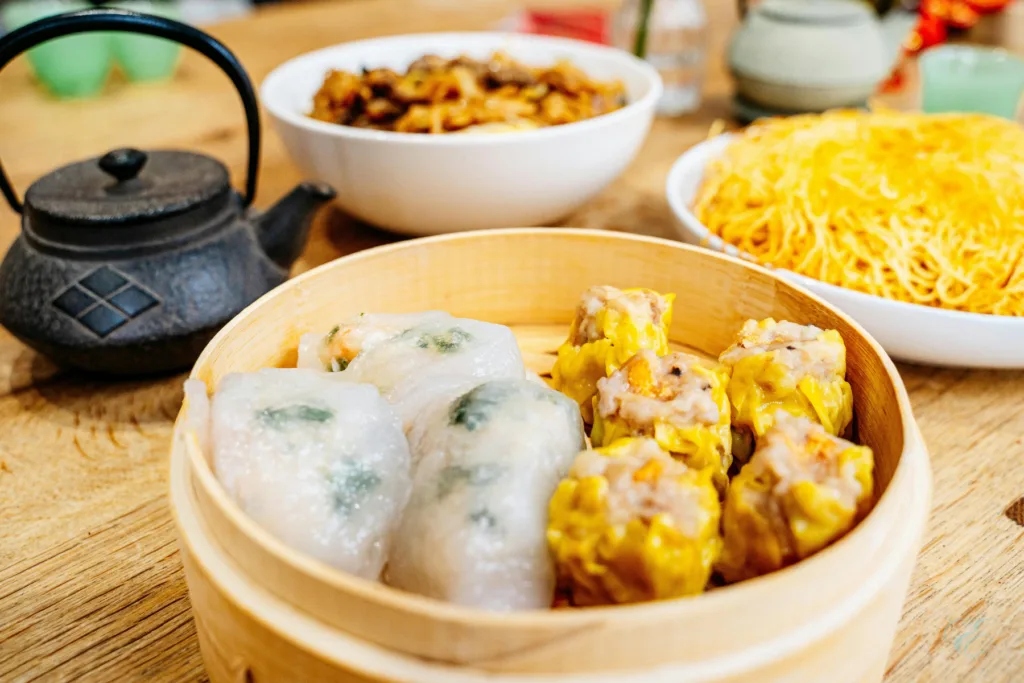 - Dim Sum – steamed, fried, baked or broiled dishes like dumplings and buns served in a bamboo basket. Look for har go (shrimp dumplings), sui mai (pork and shrimp dumplings), char siu bao (barbecue pork buns), and egg tarts
